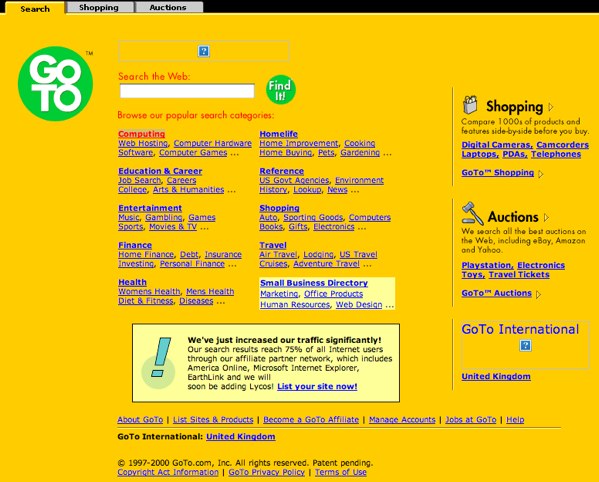 La idea de la publicidad contextual (segmentada en función de lo que el usuario ha introducido y de la página de búsqueda que ha generado) no se le ocurrió a Google. En realidad, proviene de otra empresa, llamada Goto.com, posteriormente rebautizada como Overture, y que finalmente fue adquirida por Yahoo! y vuelta a bautizar como Yahoo! Search Marketing. En su momento, Overture llevó a los tribunales a Google por haber copiado la idea de subastar anuncios en los resultados de las búsquedas. El caso, tras una dura batalla legal, acabó en un pacto extrajudicial en Agosto de 2004 coincidiendo con la salida a bolsa de Google, que pagó a Yahoo! 2.7 millones de acciones (entre $260 y $290 millones) a cambio de una licencia perpetua de las tecnologías en cuestión.