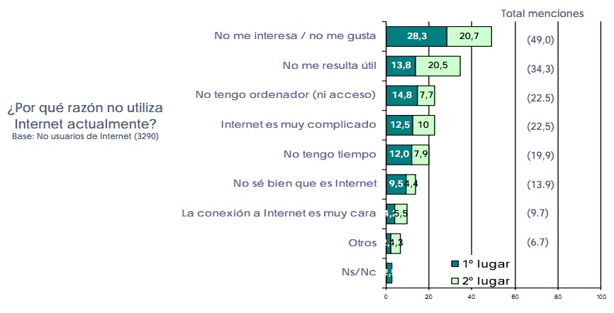La indiferencia es uno de los grupos habitualmente más numerosos en muchos países. En España, el desinterés supone el porcentaje más elevado en las razones para no conectarse a Internet: personas que son incapaces de ver estímulo alguno en las infinitas posibilidades de la red, o que se refugian y autojustifican en los infinitos y bien alimentados tópicos que la rodean. El examen cuidadoso de esos tópicos revela, en realidad, mucho más que simple ignorancia. El hecho de que resulte casi imposible escuchar la palabra "Internet" en la práctica totalidad de los informativos de radio y televisión sin que aparezca rodeada de connotaciones negativas se relaciona con el hecho de que dichos medios han detectado, desde hace mucho tiempo, dinámicas de sustitución en el consumo de los usuarios: Internet es, en la práctica, uno de los peores y más temidos competidores de medios convencionales como la televisión. El hecho de que las cifras desmientan tales advertencias de peligro no es óbice para que un amplio porcentaje de la población, especialmente aquella que recibe la mayoría de la información a través de otros medios, siga creyendo en mitos que afirman que Internet es un lugar peligroso donde constantemente roban tarjetas de crédito y donde la delincuencia campa por sus respetos cual si fuera el salvaje Oeste.