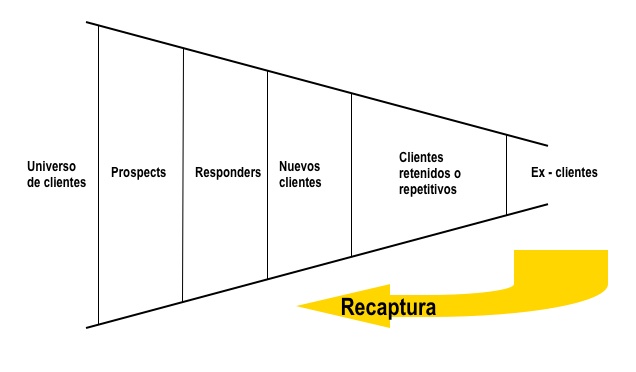 Un primer filtro convierte al universo de clientes en un conjunto más definido: los llamados "prospects", o clientes potenciales. Un subconjunto del anterior, todavía indefinido, y creado a partir de las características del producto: si mi producto está pensado para este tipo de gente, y dado que este tipo de gente lee esto, ve esto y pasea por esta zona, puedo ir a por ellos en estas ocasiones. Desde ahí, una segmentación más nos lleva a los llamados "responders", definidos como aquellos que han reaccionado a mi llamada, han pedido información adicional o, de alguna manera, han dado pruebas de su existencia. Algunos de esos, lógicamente en una cantidad que se va viendo reducida por la aplicación de los sucesivos filtros, dará un paso más y comprará nuestro producto. Y de esos, algunos se convertirán en consumidores habituales o fieles del mismo, particularmente cuando hablamos de bienes distintos a los llamados "durables", cuya adquisición retira literalmente al comprados del mercado durante un tiempo largo. Finalmente, algunos de estos clientes habituales o fieles, eventualmente, dejará de serlo: habrá encontrado otro producto que le satisface más, habrá habido algo del nuestro que no le gustó o, simplemente y sin ningún tipo de acción por nuestra parte, habrá cambiado sus circunstancias de alguna manera. Puede haber cambiado sus hábitos, su lugar de residencia, su estado civil... puede incluso que se haya muerto, que nos pongamos como nos pongamos, son cosas que tiene la vida - que de vez en cuando va y se acaba.
