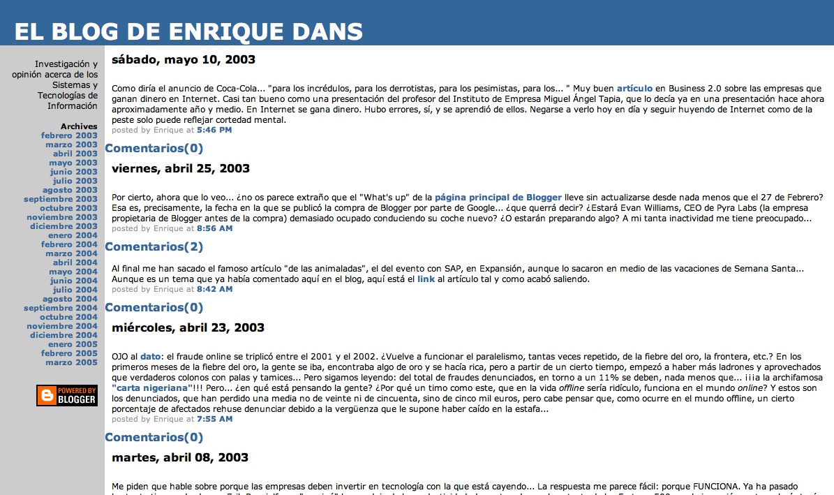 En el año 2003, me encontré con una nueva herramienta: el blog. Aunque llevaba tiempo leyendo blogs de otras personas, fue la noticia de que Google adquiría Pyra Labs, una pequeña startup creadora de un servicio llamado Blogger, el 21 de febrero de 2003, la que me hizo decidirme: el comentario de esa noticia es, de hecho, la primera entrada en mi blog después de saludar. Cuando a principios de 2003, deslumbrado por la facilidad y versatilidad del formato blog, escribí en Expansión una de las primeras columnas que mencionaban en un diario español la palabra "blog" y terminaba con la frase "en el futuro, seguramente, habrá un blog en su vida" parece que no andaba del todo desencaminado: hoy, los blogs forman parte de la forma de comunicar de millones de personas, empresas y medios de comunicación de todo el mundo.